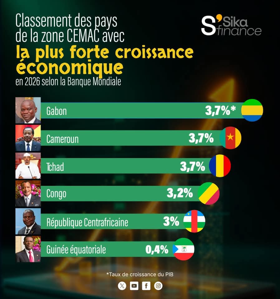 Selon les dernières perspectives économiques publiées par la Banque mondiale, les économies de la Communauté économique et monétaire de l’Afrique centrale devraient connaître, en 2026, une progression globalement stable, mais modérée. Dans cet ensemble régional marqué par une forte dépendance aux matières premières, trois pays devraient se distinguer par une performance relativement similaire : le Gabon, le Cameroun et le Tchad, chacun attendu avec un taux de croissance d’environ 3,7 % du produit intérieur brut.