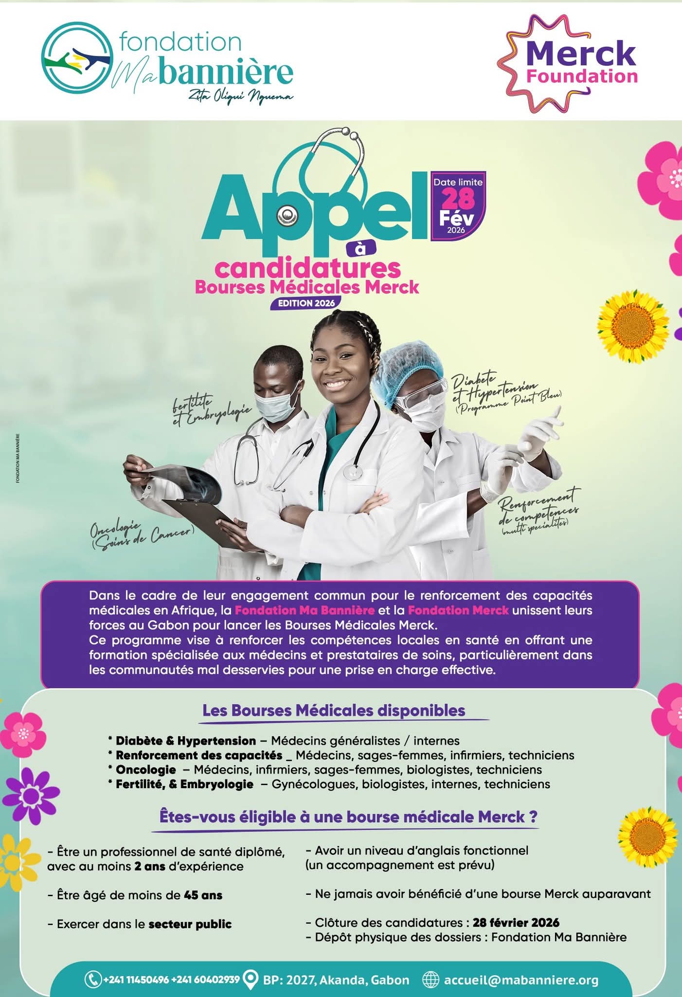 Dans un contexte où la formation spécialisée des professionnels de santé constitue un enjeu majeur pour l’amélioration de l’offre de soins, la Fondation Ma Bannière et la Fondation Merck lancent au Gabon l’édition 2026 des Bourses Médicales Merck, un programme destiné à renforcer les compétences médicales locales, notamment dans les communautés les moins desservies.